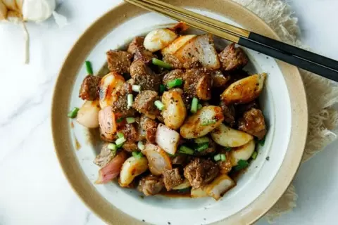 Начните с нагрева сковороды. Обжарьте стейк на сильном огне примерно 3 минуты, переворачивая для равномерного прогрева. Затем дайте мясу немного отдохнуть, после чего нарежьте его кубиками размером около 1,5 см.В отдельной чашке смешайте все ингредиенты для соуса. Нарежьте красный лук и измельчите зеленый лук.На той же сковороде разогрейте растительное масло и обжарьте зубчики чеснока до появления золотистой корочки. Затем добавьте кубики говядины и нарезанный красный лук. Обжаривайте еще около одной минуты.Добавьте тщательно перемешанный соус к мясу (не забудьте размешать соус, так как крахмал может осесть) и хорошо перемешайте все ингредиенты. Через пару минут можно снимать сковороду с огня. Перед подачей посыпьте все нарезанным зеленым луком.Приятного аппетита!