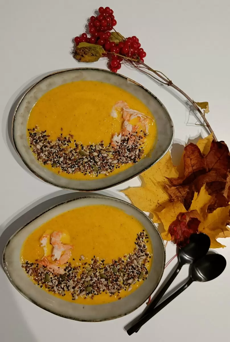 В завершение блюдо можно украсить семенами, свежей зеленью и подать с вареными или обжаренными креветками. Этот суп станет незаменимым на вашем столе в холодные осенние вечера, даря атмосферу уюта и тепла.