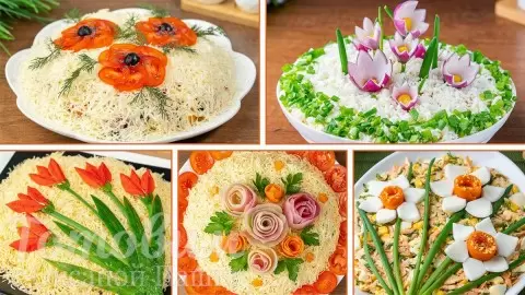 Каждый из представителей этой подборки имеет свои уникальные ингредиенты и способы подачи. Например, салат с цветами выглядит эффектно благодаря гирляндам из свежих овощей, а салат с нарциссами удивляет своей простотой и оригинальным оформлением.