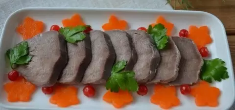Язык порезать тонкими пластинами и аккуратно уложить в форму, желательно в виде «елочки», чтобы выглядеть эффектно. Украсьте блюдо веточками петрушки, ягодами брусники и ломтиками моркови. Теперь залейте это бульоном с желатином - сначала тонким слоем и уберите в холодильник на 30-40 минут. Затем добавьте еще бульона и оставьте в холодильнике на 1,5-2 часа. Последний шаг: снова залейте бульоном и дайте застыть в течение 3 часов. Готовое заливное будет не только вкусным, но и очень привлекательным на праздничном столе.