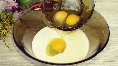 Всыпьте разрыхлитель и муку, перемешивая тесто до консистенции, которая легко стекает с лопатки — оно не должно быть слишком густым. На 300 мл кефира потребуется 210-220 г муки.