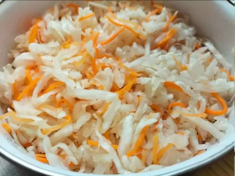 2. Мелко нарежьте капусту и нарежьте морковь на средней терке. Овощи перемешайте и поместите в чистую кастрюлю.