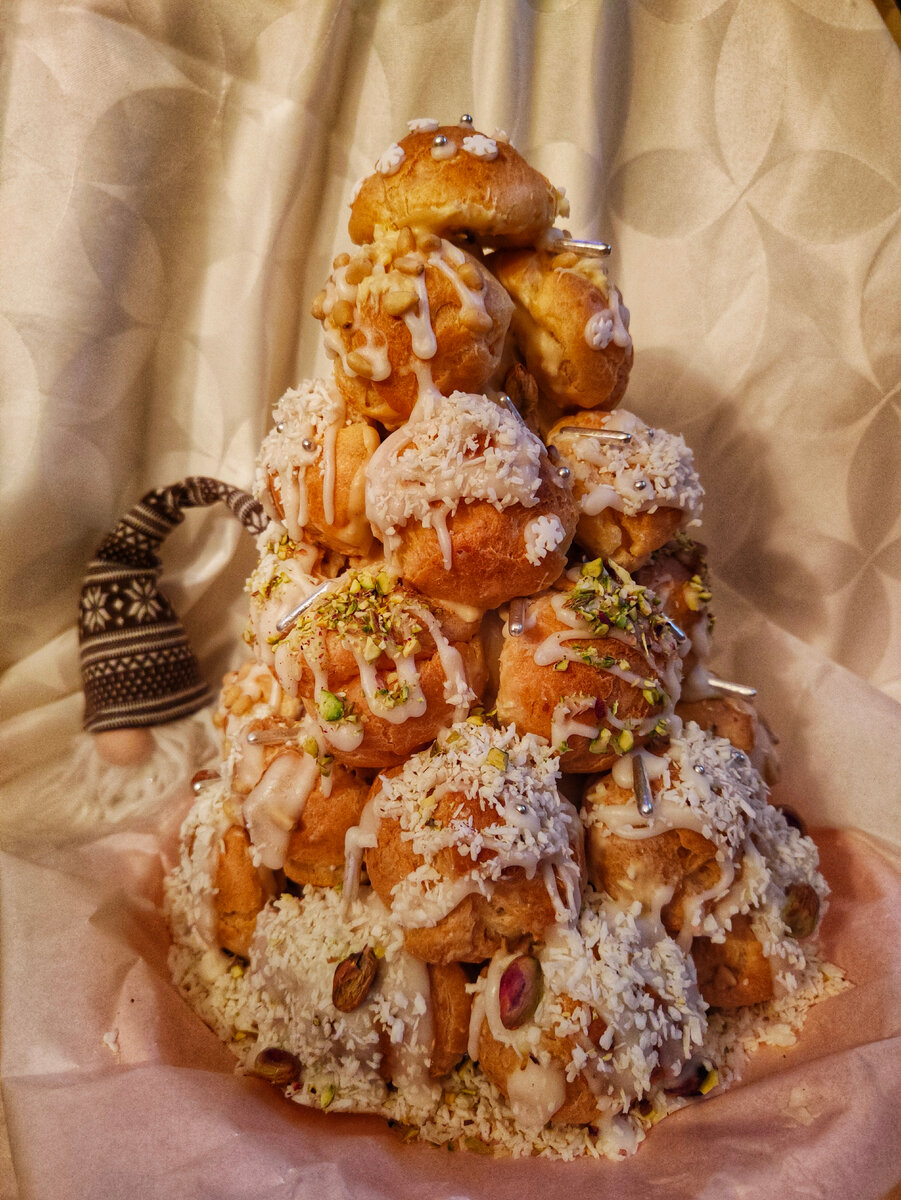 Крокембуш – это настоящий кулинарный шедевр, представляющий собой конусную башню из вкусных заварных пирожных, наполненных нежным кремом. Этот десерт нашел свое место не только в сердце гурманов, но и на праздничных столах, особенно в Новый год и Рождество. Его форма напоминает яркую рождественскую елку, что делает его идеальным украшением для любых торжеств.